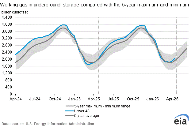 Working gas in storage was 2,063 Bcf as of Friday, April 17, 2026, according to EIA estimates. This represents a net increase of 103 Bcf from the previous week. Stocks were 142 Bcf higher than last year at this time and 137 Bcf above the five-year average of 1,926 Bcf. At 2,063 Bcf, total working gas is within the five-year historical range.