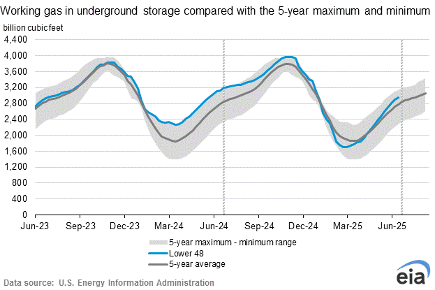 Working gas in storage was 2,953 Bcf as of Friday, June 27, 2025, according to EIA estimates. This represents a net increase of 55 Bcf from the previous week. Stocks were 176 Bcf less than last year at this time and 173 Bcf above the five-year average of 2,780 Bcf. At 2,953 Bcf, total working gas is within the five-year historical range.