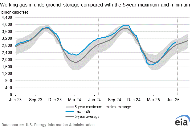 Working gas in storage was 3,006 Bcf as of Friday, July 4, 2025, according to EIA estimates. This represents a net increase of 53 Bcf from the previous week. Stocks were 184 Bcf less than last year at this time and 173 Bcf above the five-year average of 2,833 Bcf. At 3,006 Bcf, total working gas is within the five-year historical range.