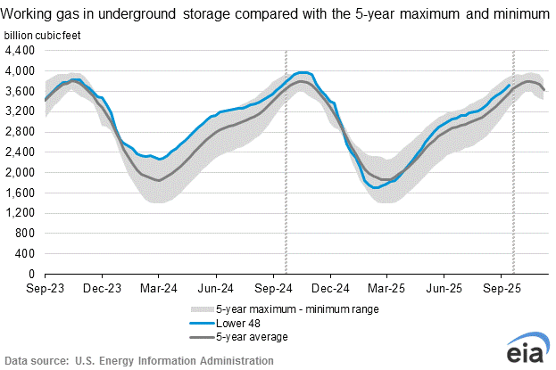 Working gas in storage was 3,721 Bcf as of Friday, October 10, 2025, according to EIA estimates. This represents a net increase of 80 Bcf from the previous week. Stocks were 26 Bcf higher than last year at this time and 154 Bcf above the five-year average of 3,567 Bcf. At 3,721 Bcf, total working gas is within the five-year historical range.