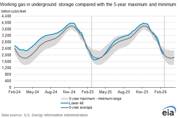Working gas in storage was 2,070 Bcf as of Friday, February 13, 2026, according to EIA estimates. This represents a net decrease of 144 Bcf from the previous week. Stocks were 59 Bcf less than last year at this time and 123 Bcf below the five-year average of 2,193 Bcf. At 2,070 Bcf, total working gas is within the five-year historical range.